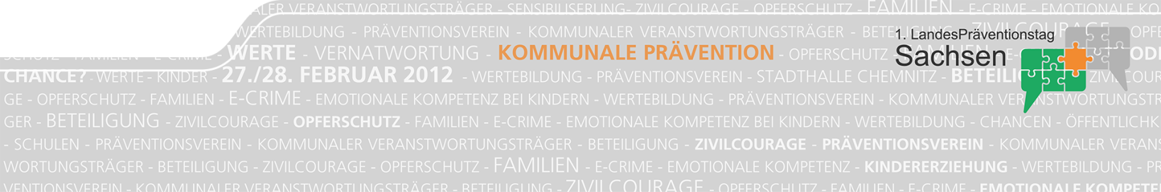 Am 27. und 28. Februar 2012 fand in der Stadthalle Chemnitz der 1. LandesPräventionstag Sachsen statt. Im Schwerpunktthema widmete er sich der Kommunalen Prävention. Das Thema wurde als Auftakt auch vor dem Hintergrund gewählt, dass fast jede Präventionsmaßnahme kommunal gewollt, geplant und umgesetzt werden muss. Ohne Unterstützung der Verwaltungsspitzen, relevanter Behörden, Institutionen, der Kommunalpolitik sowie der engagierten Bürgerschaft kann Prävention vor Ort letztendlich nicht erfolgreich sein.